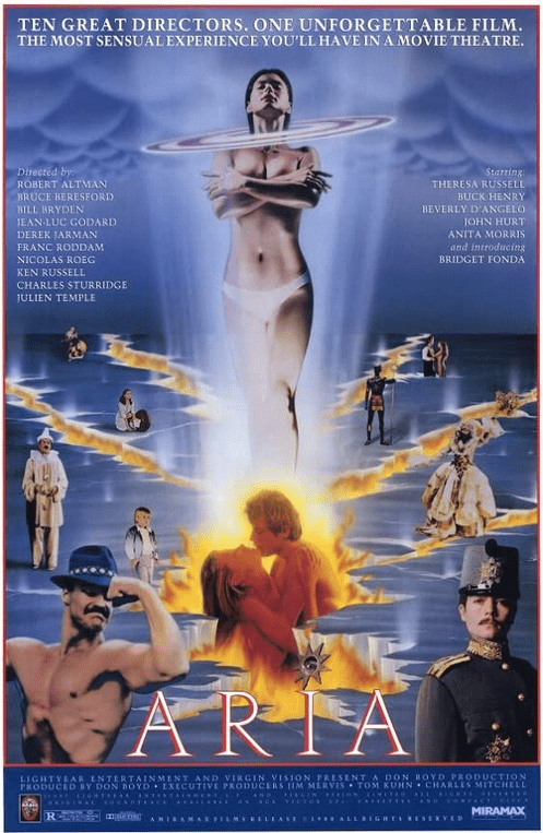 Quoiqu’on en dise (boursouflure féerique, monument de mauvais goût ou chef-d’œuvre quasi expérimental ?), Fantasia, c’était quand même un peu du clip avant l’heure. Normal qu’en plein cœur des années 80, soit l’ère du music video, le concept revienne à la charge, mais cette fois dans un film live. Dans Aria, on retrouve donc l’idée d’illustrer un morceau de musique classique, en l’occurrence d’opéra, avec des saynètes déconnectées les unes des autres. C’est plutôt sympa sur le papier et c’est carrément excitant quand on voit la somme de talents réunis, puisque chaque segment est signé par un réalisateur différent. Parmi les pointures, Jean-Luc Godard, Nicolas Roeg, Robert Altman ou Ken Russell ont été invités pour mettre en image des pulsions d’amour et de mort, en totale liberté. Mega-chaos me direz-vous. À l’arrivée, et on en est un peu désolés, Aria n’est ni un ratage, ni un chef-d’œuvre, mais une très belle curiosité, qu’on a manifestement à l’époque très vite enterrée.