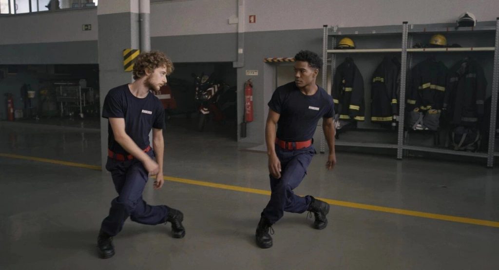 Sinon, ajoutons un petit mot, toujours à la Quinzaine, sur Fogo-Fatuo du Portugais João Pedro Rodrigues (interview chaos à lire ici). Sur son lit de mort, Alfredo, roi sans couronne, est ramené à de lointains souvenirs de jeunesse et à l’époque où il rêvait de devenir pompier. La rencontre avec l’instructeur Afonso, du corps des pompiers, ouvre un nouveau chapitre dans la vie des deux jeunes hommes voués à l’amour et au désir, et à la volonté de changer le statu quo. On est un peu restés sur la touche avec celui-ci (aucun rapport avec le fait qu’on ne soit pas rentrés à la soirée post-projo, hein!), annoncé dans son générique comme une fantaisie musicale par l’auteur d’O Fantasma. Cette histoire où un zozo neurasthénique – bon sang qu’on a envie de le secouer le bonhomme! – plaque sa famille royale de boomers pour s’enticher d’un pompier qui mime des tableaux de Caravage en slibard avec ses collègues provoque quelques sourires, promet quelques malaises aux spectateurs non avertis (et paf! Première éjac’ faciale sur grand écran de notre festival!) mais use dans le même temps de quelques grosses ficelles humoristiques qui peuvent un peu agacer. Reste un beau discours de João envers Paolo Moretti pour sa dernière…