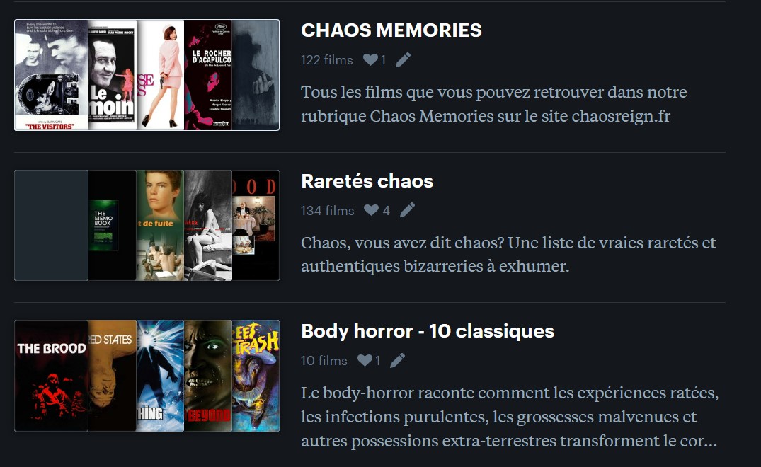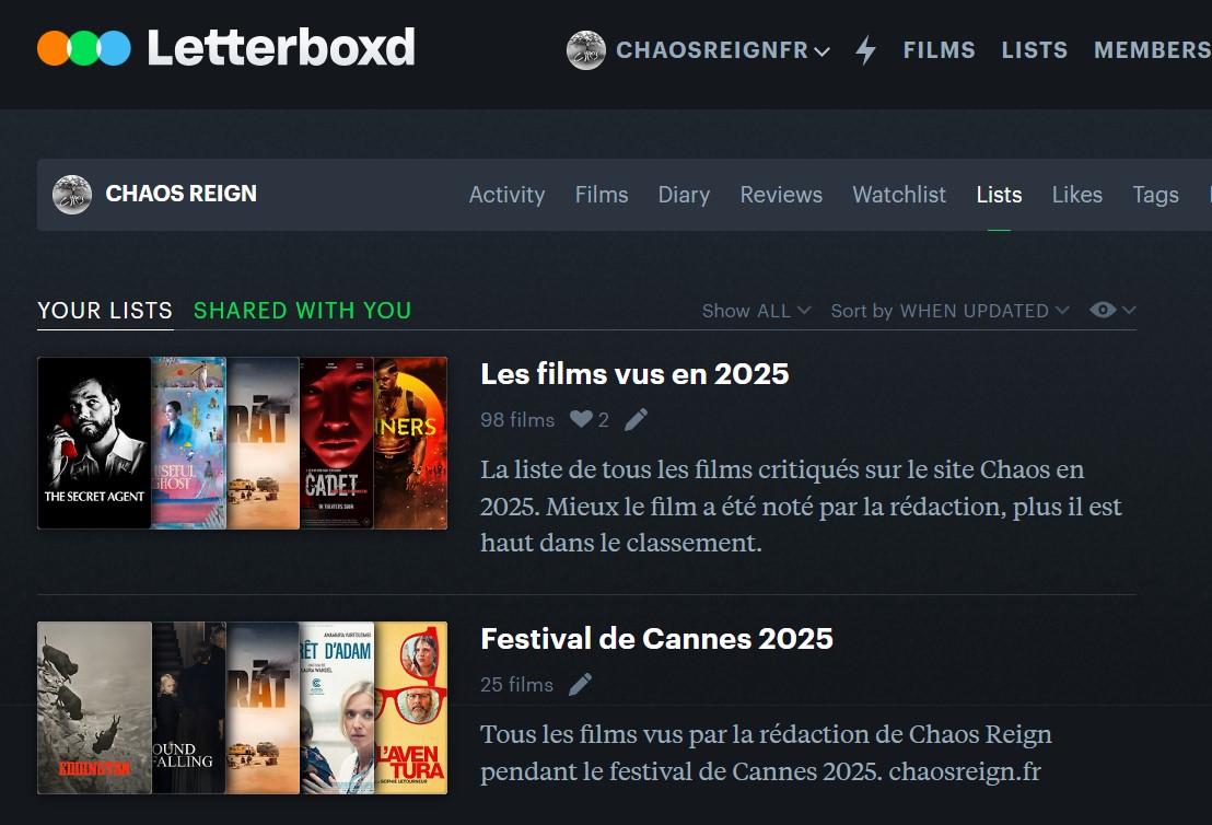 Votre site préféré a référencé toutes ses listes (films de l’année, chaos memories, chaos interdit…) sur le fameux site Letterboxd. Génial, hein ? Alors, question : comment faire pour nous rejoindre ? Inscrivez-vous si vous n’êtes pas encore inscrit et rejoignez le club sur ce lien.