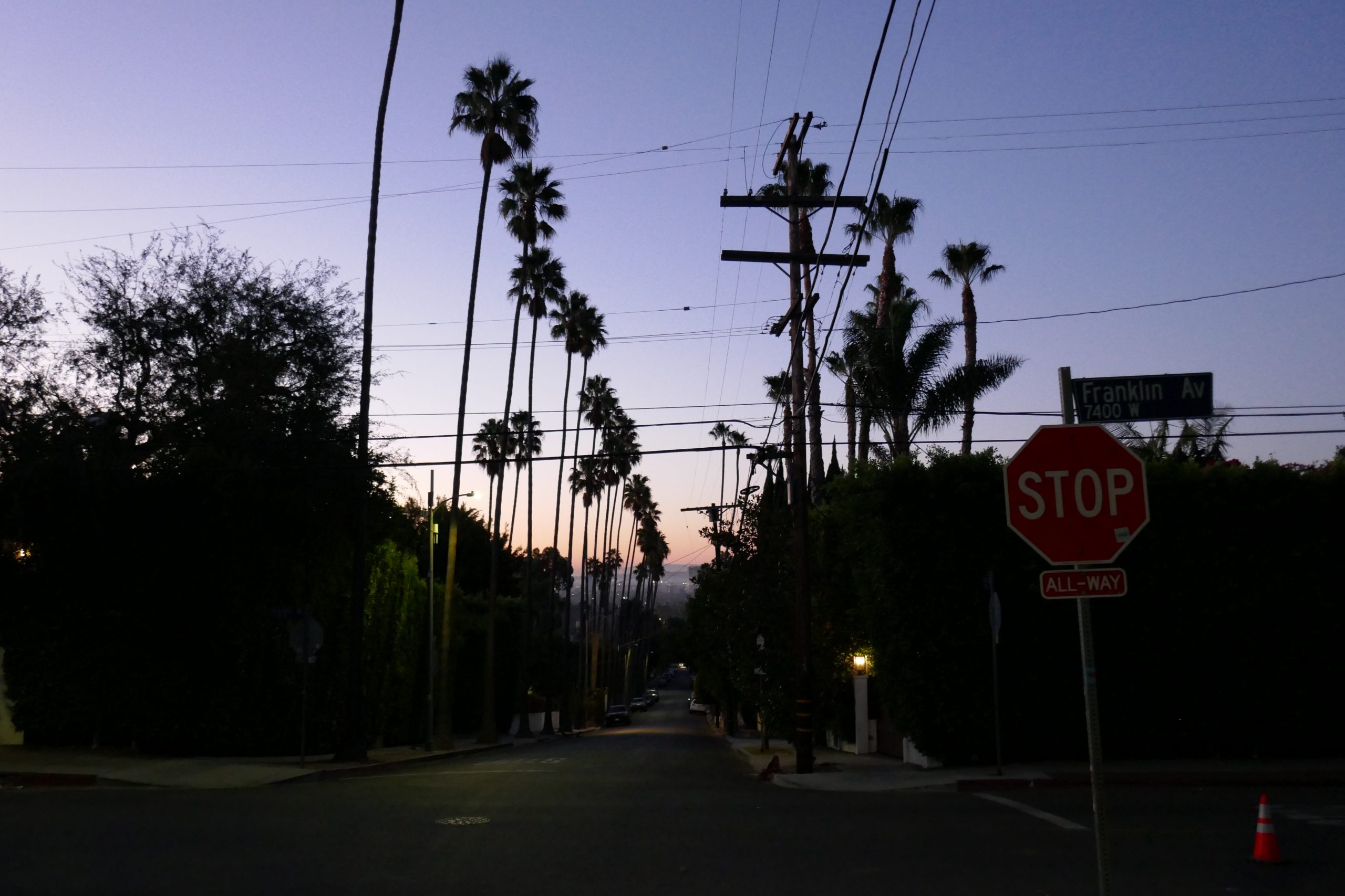 Dans cette ville mal éclairée, et pas adaptée pour les piétons, le dépaysement peut en étourdir plus d’un, surtout en attaquant la ville sans voiture. Marcher à L.A. c’est comme mener la vie d’un chat domestique. Tu attends beaucoup. Et quand tu peux avancer, tu te déplaces dans un monde qui n’est pas à ton échelle. L’humain n’est pas l’être vivant dominant. La voiture l’est. Je vois enfin Vista et reconnais la ligne de palmiers de mon fond d’écran d’ordinateur, resté à Paris. Cette longue ligne de palmiers sur le flanc gauche, et ces arbres ronds à droite, c’est sans doute là. Rita est passée par-là c’est sûr. Elle a trébuché où j’ai trébuché, cherché son chemin, comme moi, sans doute sans savoir où aller. Seule différence: elle est allée beaucoup plus loin que moi dans son aventure nocturne. J’y suis allé plus tard pendant le séjour, l’appartement de Coco est à environ une heure de plus, avec de bonnes jambes. Il faut repasser par Sunset et prendre au sud, sur La Brea. Là où ça ne donne pas du tout envie de marcher. J’admire le courage.