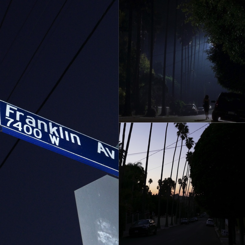 5h30. Je vois un gars faire son jogging et ça me rassure. Le ciel commence à devenir bleu. Je vais pouvoir faire des photos, et avoir une vue dégagée. Pour tourner la scène, David Lynch a placé un énorme spot lumineux à l’entrée de Vista, monté sur une grue amovible, qui éclairait la rue depuis le sud, face à Laura Harring donc, vue à contrejour dans le plan, se dirigeant vers la lumière. Il fallait y penser. C’était bien vu. En France, n’importe quelle rue, n’importe quel croisement est éclairé. Ici, c’est le noir complet. Le spot lumineux apporte non seulement une visibilité, mais permet de voir la ligne de palmiers sur les côtés, placés comme des barreaux de prison. Je suis au croisement de Vista et Franklin. le «STOP» est là. Dans le film, Rita se retourne, éclairée par les phares d’une voiture, puis continue son chemin sur Vista Street. Lynch a filmé le panneau 7400 W Franklin. C’est le deuxième panneau bleu qu’on voit dans le film, après celui de Mulholland Dr., au générique. C’est la couleur des panneaux de toutes les rues de Los Angeles, et c’est aussi le même bleu que celui de la boîte qu’ouvre Betty dans ses appartements. Sur cette photo, vous pouvez voir le hors champ. Là où Rita traverse et à gauche, la photo que j’ai prise: presque rien n’a bougé. Pas de nouvelles constructions, ni de nouveaux immeubles. La majorité des appartements datent des années cinquante.