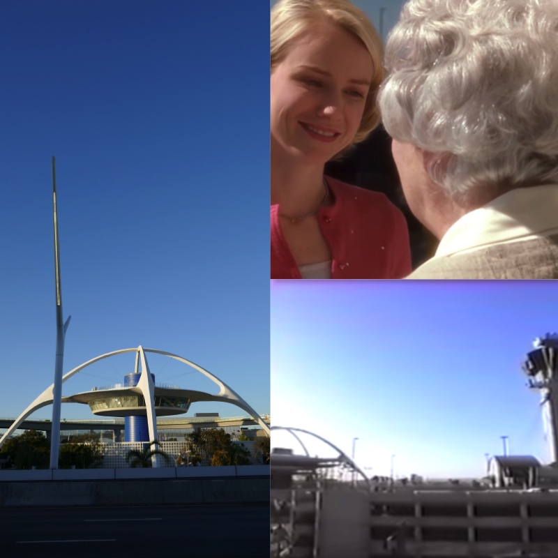 Dans une interview accordée à la chaîne Criterion, David Lynch confie qu’il a demandé à Naomi Watts de voir l’aéroport comme une petite fille verrait une montagne de bonbons ou de confiseries. Elle a donc ce regard excessivement émerveillé, qui la met dans une position d’ange tombée du ciel. La musique d’Angelo Badalamenti aidant à marquer ce caractère innocent et sage, et dissout aussi toute ambivalence quant à ses intentions, y compris lorsqu’elle répond à Irene qu’elle va bien évidemment la tenir au courant de sa future carrière. On imagine qu’ils en ont parlé dans l’avion. Elle dit avoir été anxieuse et pressée d’arriver. Je me demande ce qu’elle a pensé des rocheuses et du désert en les voyant. Le niveau des départs, où ils sont dans le film, et où je me trouve à ce moment-là, est situé au niveau supérieur, contrairement à celui des arrivées. Parce qu’il est plus haut, il permet de voir ce magnifique soleil doré qui impressionne quiconque arrive à L.A. pour la première fois. J’imagine que David Lynch a également été impressionné, lorsqu’il a débarqué ici, peu de temps avant de tourner Eraserhead, en 1971.