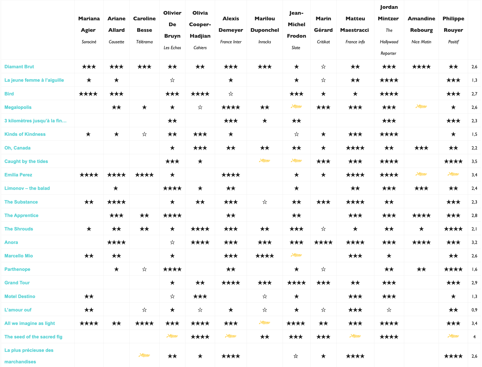 | Mariana Agier Sorociné | Ariane Allard Causette | Caroline Besse Télérama | Olivier De Bruyn Les Echos | Olivia Cooper-Hadjian Cahiers | Alexis Demeyer France Inter | Marilou Duponchel Inrocks | Jean-Michel Frodon Slate | Marin Gérard Critikat | Matteu Maestracci Franceinfo | Jordan Mintzer The Hollywood Reporter | Amandine Rebourg Nice Matin | Philippe Rouyer Positif | ||