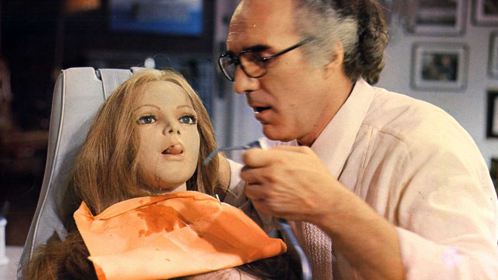 À la barre, Luis Garcia Berlanga, un agitateur ibérique lui aussi très oublié, dont l’obsession pour l’humour retors et la satire noire en fait un cousin certain de Luis Buñuel. Évidemment chassé par la censure franquiste après de nombreux films acides, tels que Le bourreau ou Vivan los novios!, Berlanga alla naturellement faire en saut en France, où des auteurs aussi fous que Fernando Arrabal pouvait tourner à leur guise. À l’écriture, un Jean-Claude Carrière, à l’époque toujours dans les bons coups, et Michel Piccoli en tête d’affiche. Piccoli chaos qui, déjà quasi quinqua à l’époque, n’avait pas peur de tremper dans le chaos pur jus, amoureux d’une chevelure chez Ado Kyrou, crevant dans ses flatulences chez Marco Ferreri, retournant à l’état sauvage dans l’improbable Themroc, sautillant entre Buñuel, Chabrol et Sautet: Michel can do it, même incarner un dentiste amoureux de sa poupée gonflée (mais pas gonflable).