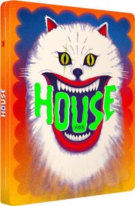 « On peut l’asséner: House (Hausu pour les intimes) est bel et bien la variation sur le thème « plus éculé tu meurs » de la maison hantée la plus frappadingue que l’on ait vue au cinéma. On peut aussi le présenter comme « le parfait film d’horreur pour jeunes ados ». Ou bien le résumer, avec nos balises de cinéphiles, à « une relecture du Magicien d’Oz (et ses décors en trompe-l’œil) par Mario Bava ». Ou encore autre chose… Quelque chose qui ne ressemble à rien de réellement connu… La raison pour laquelle ce film inédit et magique de 1977 est à ce point instantanément culte, provient de sa cadence folle, de son rythme frénétique, de ses effets cartoonesques qui donnent à croire en l’incroyable. C’est un déchainement continu et sans répit d’une profusion d’artifices fous (images subliminales, superpositions, filtres de couleurs, split-screen, matte painting, stop motion) qui littéralement submergent celle ou celui qui regarde sans pour autant l’assommer. Pour la simple raison qu’il ne s’agit pas là d’un simple grand bain formel, mais d’un film qui stimule durablement l’imaginaire par ses idées venues d’ailleurs (et à hurler de rire), à l’instar de ce sublime angora blanc en guise de chat noir maléfique, qui joue du piano et qui chante!
