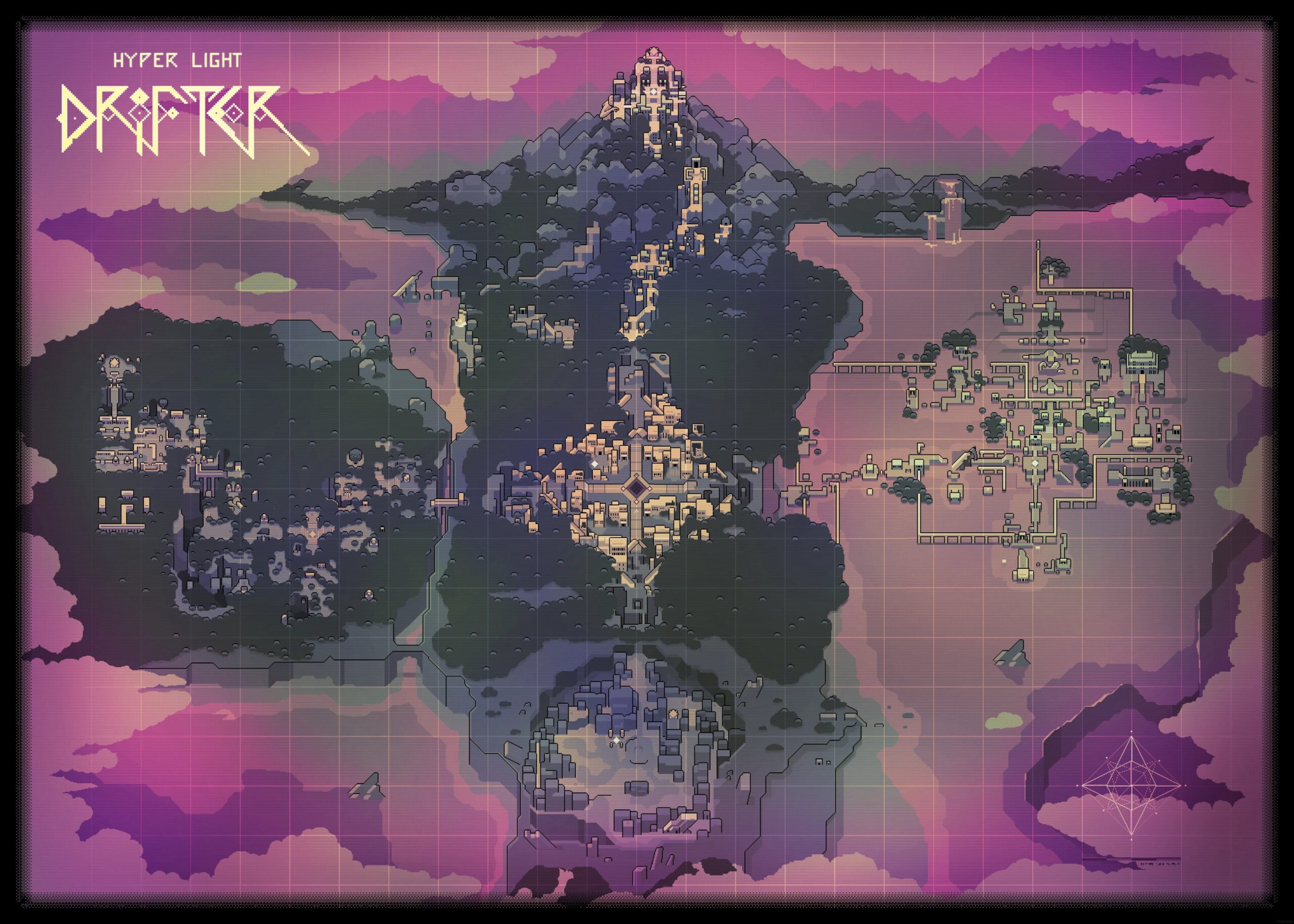 En quelques pages, la géographie du monde fantastique dans lequel Dorothée vient de mettre les pieds est posée: Oz est un monde-pays aux frontières finies, bordé d’un désert infranchissable. Intrinsèquement, Oz est un espace vidéoludique, cet espace clos, dont même les plus grandes itérations nécessitent de la part du joueur une forme de crédulité volontaire pour le penser infini. On peut alors penser à Red Dead Redemption 2 et son monde gigantesque, qui outre le fait d’exploiter comme Frank Baum la tension entre une civilisation supposément pré-civilisée et une autre, technologique, appelée à la remplacer, possède une dissonance fondamentale : pour autant que les montagnes à l’horizon semblent éloignées et vertigineuses, elles ne sont jamais autre part que dans un périmètre d’existence déterminé, qui est celui du jeu. Jouer à un jeu, c’est accepter une histoire, pire, un monde, qui comme celui d’Oz, existe dans un vase clos. On y pénètre, on en explore les limites et on le quitte, l’abandonnant à sa solitude. En plus d’être clos, le monde d’Oz est, comme plus tard celui d’Hyper Light Drifter par exemple, structuré autour de ses quatre points cardinaux et découpés ainsi, en quatre zones similaires organisées autour d’une cinquième, son centre (la comparaison de la carte du monde d’Oz avec celle du jeu de Alx Preston est troublante).