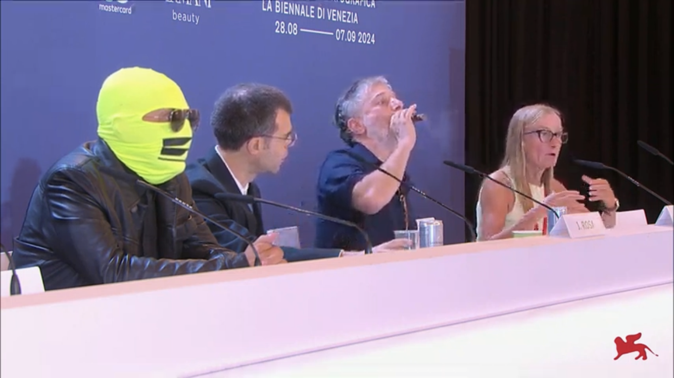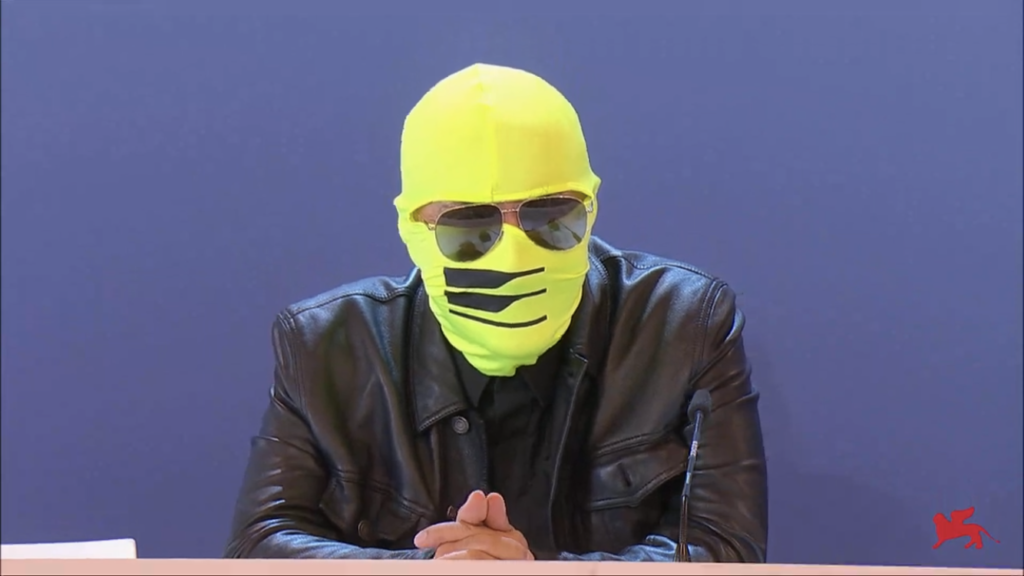 On est un peu comme Fred des Anges de la télé-réalité avec Shanna: on attend qu’il fasse son show! Comme l’année dernière avec son Aggro Dr1ft, le réalisateur Harmony Korine choisit la Mostra de Venise pour nous offrir sa nouvelle expérience hallucinée. C’est fois, c’est Baby Invasion, deuxième création de Korine, produite par son collectif de conception multimédia EDGLRD, suivant un groupe de mercenaires avec des avatars de visage de bébé se lançant dans le cambriolage des manoirs des riches et des puissants. Et une fois encore, la conférence de presse s’est révélée un bon moment, lui avec un cigare à la main et flanqué de son ami « Gaspar » arborant un masque jaune (et mutique) – c’est, évidemment, le réalisateur Gaspar Noe. Le discours, lui, reste le même: la manière dont les films sont faits aujourd’hui est caduque et le cinéaste rappelle la nécessité d’encourager Hollywood à s’intéresser aux jeunes, plus accros aux jeux vidéo et au streaming qu’au septième art.