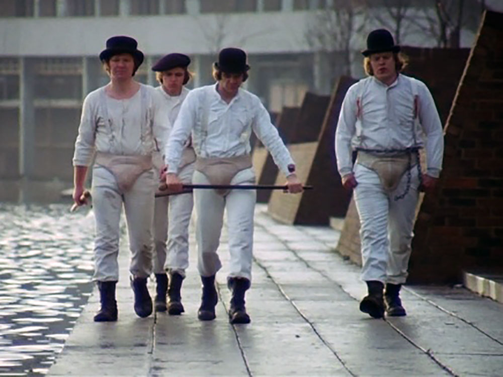Tout commence en 1962. Anthony Burgess, auteur britannique peu coté, sort un roman dont les personnages sont des loubards maquillés parlant le nadsat; un langage panachant l’anglo-saxon et le russe. Ils violent, tuent, se livrent à l’ultra-violence en descendant des gobelets de lait renforcé à la cocaïne (ou dieu sait quoi). Le livre paraît; scandale! Un romancier, Terry Southern, achète les droits. Le scénario est envoyé à Kubrick. A l’époque, il y avait tous les jours des bagarres entre les mods et les rockers en Angleterre et la censure anglaise a refusé le script. Pour violence et vulgarité. Deux hommes d’affaires, Si Litvinoff et Max Raah, avaient racheté l’option. Kubrick aimait le livre qu’il avait lu pendant le tournage de 2001, odyssée de l’espace et considérait que l’étrangeté du roman était essentielle.