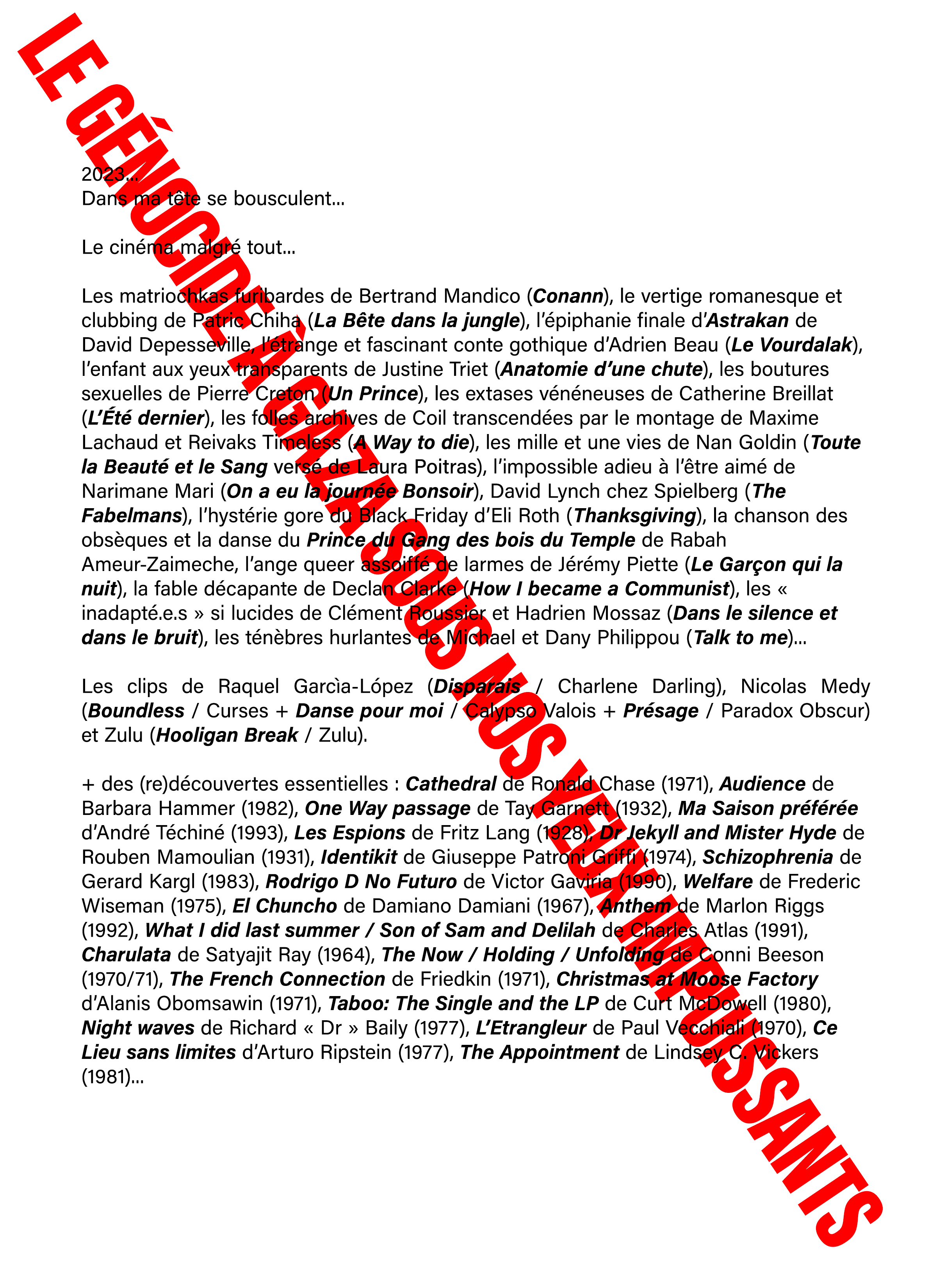 Films chaos de 2023 (dans leur ordre de visionnage): Désordres de Cyril Schäublin / Jeunesse (Le Printemps) de Wang Bing / Les Herbes sèches de Nuri Bilge Ceylan / L’été dernier de Catherine Breillat / Fermer les yeux de Victor Erice