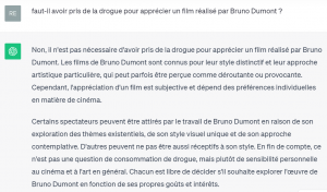 Réponse de ChatGPT: Non, il n’est pas nécessaire d’avoir pris de la drogue pour apprécier un film réalisé par Bruno Dumont. Les films de Bruno Dumont sont connus pour leur style distinctif et leur approche artistique particulière, qui peut parfois être perçue comme déroutante ou provocante. Cependant, l’appréciation d’un film est subjective et dépend des préférences individuelles en matière de cinéma. Certains spectateurs peuvent être attirés par le travail de Bruno Dumont en raison de son exploration des thèmes existentiels, de son style visuel unique et de son approche contemplative. D’autres peuvent ne pas être aussi réceptifs à son style. En fin de compte, ce n’est pas une question de consommation de drogue, mais plutôt de sensibilité personnelle au cinéma et à l’art en général. Chacun est libre de décider s’il souhaite explorer l’œuvre de Bruno Dumont en fonction de ses propres goûts et intérêts.