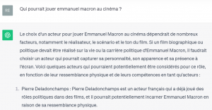 Réponse de ChatGPT: Le choix d’un acteur pour jouer Emmanuel Macron au cinéma dépendrait de nombreux facteurs, notamment le réalisateur, le scénario et le ton du film. Si un film biographique ou politique devait être réalisé sur la vie ou la carrière politique d’Emmanuel Macron, il faudrait choisir un acteur qui pourrait capturer sa personnalité, son apparence et sa présence à l’écran. Voici quelques acteurs qui pourraient potentiellement être considérés pour ce rôle, en fonction de leur ressemblance physique et de leurs compétences en tant qu’acteurs: