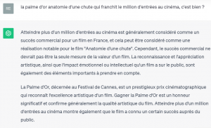 Réponse de ChatGPT: Atteindre plus d’un million d’entrées au cinéma est généralement considéré comme un succès commercial pour un film en France, et cela peut être considéré comme une réalisation notable pour le film Anatomie d’une chute. Cependant, le succès commercial ne devrait pas être la seule mesure de la valeur d’un film. La reconnaissance et l’appréciation artistique, ainsi que l’impact émotionnel ou intellectuel qu’un film a sur le public, sont également des éléments importants à prendre en compte. La Palme d’Or, décernée au Festival de Cannes, est un prestigieux prix cinématographique qui reconnaît l’excellence artistique d’un film. Gagner la Palme d’Or est un honneur significatif et confirme généralement la qualité artistique du film. Atteindre plus d’un million d’entrées au cinéma montre également que le film a connu un certain succès auprès du public. En fin de compte, ce qui compte le plus pour un film, c’est son impact artistique, sa réception critique et son succès auprès du public, ainsi que la manière dont il parvient à raconter une histoire ou à explorer des thèmes importants. Atteindre un million d’entrées est un indicateur de popularité, mais cela ne devrait pas nécessairement déterminer la valeur intrinsèque du film. Cela dit, c’est toujours une réalisation positive pour un film d’atteindre un large public tout en recevant une reconnaissance artistique.