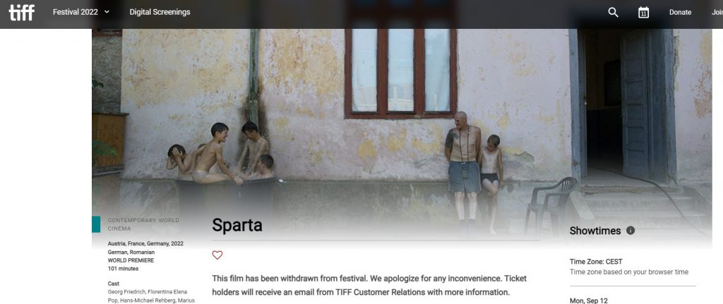 « Ce film a été retiré du festival. Nous nous excusons pour tout désagrément », peut-on lire sans plus de précisions sur le site internet du Tiff. Il s’agirait d’expliquer pourquoi. Sparta, nouveau long métrage d’Ulrich Seidl, formant un diptyque avec son premier Rimini, présenté sans le moindre problème à Berlin où il était en compétition début 2022, évoque un entraîneur autrichien de judo, joué par l’acteur Georg Friedrich, qui tente de lutter contre ses tendances pédophiles en refaisant sa vie dans une région reculée de Roumanie. La semaine dernière, l’hebdomadaire allemand Der Spiegel avait publié des témoignages anonymes de membres de l’équipe de tournage ainsi que d’enfants ayant joué dans le film et affirmant y avoir été brutalisés. Des parents sont également cités et disent ne pas avoir été correctement informés du sujet du film, toujours sous couvert d’anonymat. Des allégations balayées par le réalisateur âgé de 69 ans, habitué depuis toujours aux controverses et aux films extrêmes – il suffit de voir ses sulfureux Dog Days, la trilogie Paradis, Import/Export…