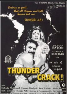 Dégoulinante de maquillage et d’alcool, la veuve Hammond s’apprête à passer une soirée désespérée comme une autre dans son manoir au milieu de nulle part. Mais voilà qu’une bande de jeunes gens, perdus pour la plupart, viennent toquer à sa porte : la femme d’un chanteur, deux jeunes filles un brin allumeuses, des hommes troublés… Bricolé, sinistre, souvent cadré serré et proche du film d’épouvante, Thundercrack ressemble à la rencontre fortuite entre Bergman et Ed Wood, mariage d’artifices, de traumatismes, de fluides corporels et de grimaces ripolinées baignant dans un noir et blanc crapoteux. Contrairement à un porno lambda où l’on cause peu, les personnages de Thundercrack n’ont de cesse de parler, parler, encore parler, de tout, de rien, de leurs névroses, de n’importe quoi, même quand ils baisent. On se croirait en plein Sade. Et ça parle tellement, que le film avoisine les 2h30, entracte compris!