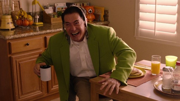 Dale revient en Dougie Jones, tulpa/double manufacturé par Mr. C pour l’empêcher de reprendre sa véritable place. Amnésique et doué d’une intelligence en apparence limitée, Dale se doit de partir travailler dans la compagnie d’assurance de Dougie. Mais son habillage et le petit déjeuner ne se passe pas comme prévu – Episode 04. Dougie Jones est une oeuvre d’art à lui tout seul, avant d’être un personnage de fiction. Mi-demeuré mi-génie, coincé dans sa chemise verte trop large et sa cravate attachée sur la tête, il réenchante le monde désolé et glauque qu’est devenu Twin Peaks (miroir de notre société, au passage). Kyle Maclachlan qui ne joue pas moins de quatre rôles différents dans cette saison 3 (chapeau bas!), invente peut être la grande figure du burlesque de ce XXIe siècle. M.B.