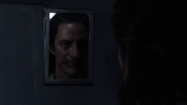 Mr. C, le double maléfique de Dale, se fait arrêter et enfermer dans une prison du Dakota du sud. Lorsqu’il se regarde dans le miroir, un morphing détonnant remplace son visage par celui du diabolique Bob – Episode 05. En s’attelant, ving-cinq ans après, à la réalisation d’une troisième saison de Twin Peaks, le grand problème auquel devait se confronter Lynch était évidemment de faire sans certains protagonistes, du fait du décès de leurs interprètes. Ils hantent Twin Peaks The Return, qui leur rend hommage, à sa manière, en les faisant réapparaitre l’espace de quelques scènes par des trucages saisissants. Le retour de Bob est génial, autant techniquement que symboliquement. D’abord par la simplicité de son procédé, un morphing, qui fait mal à Justice League et son effacement douteux de la moustache d’Henry Cavill. M.B.