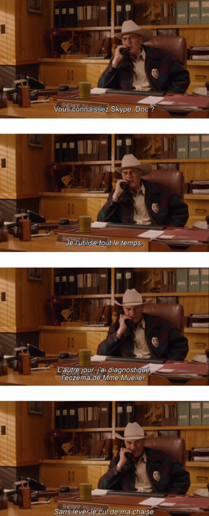 Le rapport des seniors aux nouvelles technologies est devenue ces dernières années un gimmick comique facile et usé. Pour une œuvre qui fait du vieillissement de ses personnages un de ses grands thèmes, il fallait s’attendre à ce que Lynch et Frost propose des scènes du genre. Sans surprise, ils le font avec malice et finesse. Dans l’épisode 7, le shérif Truman cherche à obtenir des informations sur Dale Cooper, notamment sur son dernier séjour à Twin Peaks. Il appelle le Docteur Hayward, qui est la dernière personne à l’avoir vu, après qu’il a été hospitalisé à la fin des évènements de la deuxième saison. Alors que la séquence aurait pu se cantonner à un échange téléphonique, le shérif Truman propose à son interlocuteur de l’appeler en visioconférence via Skype. La scène aurait pu tourner au délire moqueur sur le troisième âge, mais les auteurs nous surprennent en faisant du Docteur Hayward un utilisateur aguerri du logiciel, qui continue d’ailleurs à diagnostiquer des maladies « sans lever le cul de sa chaise ». Sans nier le principe comique de cette séquence et ce qu’elle apporte au discours de la série sur la vieillesse, elle permet également de revoir une dernière fois à l’écran Warren Frost, l’interprète du Docteur Hayward, et père de Mark Frost. Gravement malade au moment du tournage, il décède peu avant la diffusion des épisodes. On devine que la scène a été tournée telle quelle, sans tricherie.