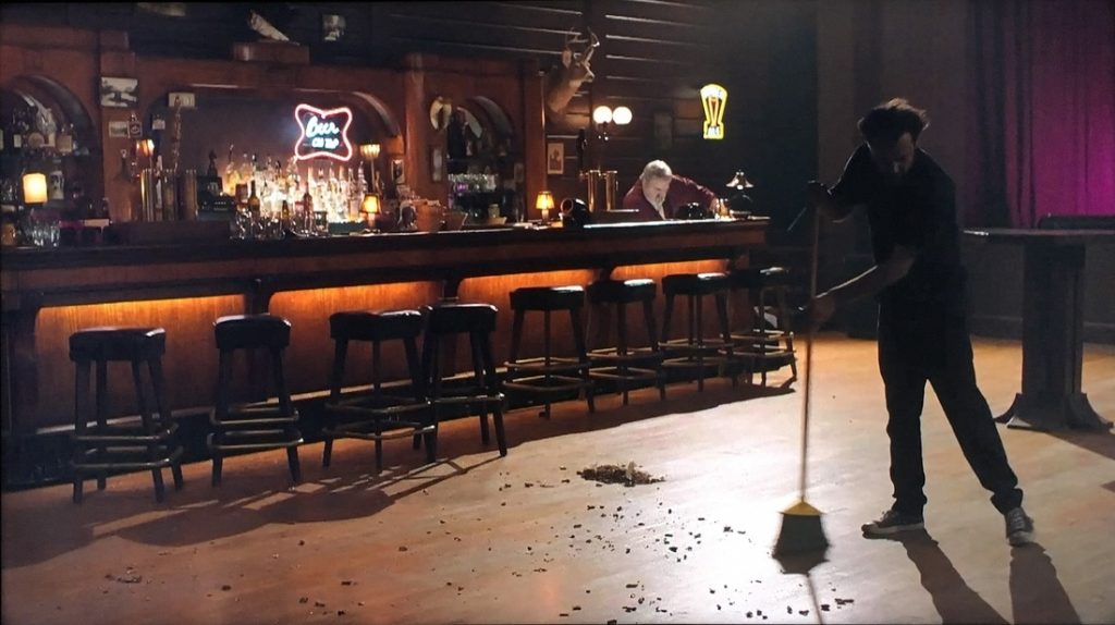 Le Roadhouse est depuis le deuxième épisode déjà le nouveau lieu central de la série (en lieu et place du Double R Diner lors des précédentes saisons), auquel on revient inlassablement, comme une respiration dans le récit, pour écouter une chanson, et qui n’a pas d’autres enjeux que d’exprimer une durée. Dans l’épisode 7, Lynch ne nous convie plus à concert. Il réduit l’habituel numéro musical à un plan fixe de plusieurs minutes, dans lequel un employé balaie la salle sur la quasi-intégralité du morceau Green Onions de Booker T and The MGs. Une séquence jugée frustrante par certains, qui laisse pourtant apprécier un pur bloc de durée aux spectateurs, avant que le récit ne refasse irruption par l’intermédiaire d’un coup de téléphone adressé à Jean-Michel Renault, qui nous rappelle vite sa légendaire vulgarité (« De vraies putes »). M.B.